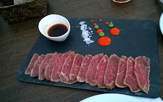 Skusiliśmy się na ośmiornica w tempurze, krokiety z szynką i marynowaną, wędzoną jamon iberico z solą, wasabi, pastą paprykową i sosem teryaki.